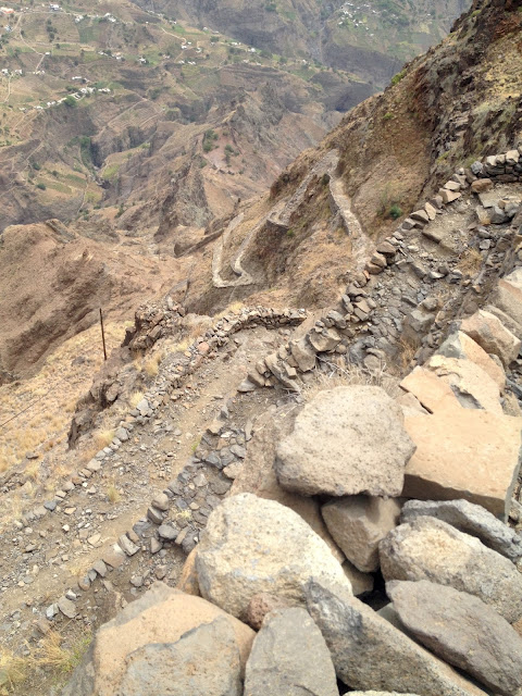 Départ matinal, via l’itinéraire 302, par Forquinha (1040m), en remontant une petite vallée étroite où le chemin là aussi se fraye un passage, à la force de travail des cap-verdiers. Remarquable. Sur l’autre versant, c’est pareil, et je croise alors une troupe d’ouvriers, hommes et femmes, qui viennent de bonne heure, travailler à l’entretien du chemin. J’aimerais bien savoir alors qui s’occupe de l’entretien de ces chemins, qui financent, qui les a construit, quand… Je n’ai pas encore les réponses car je ne parle pas le créole portugais de l’île, ni le portugais d’ailleurs alors je ne peux poursuivre la conversation bien loin. Et pourtant, ça me démange… Jusqu’à Chã de Morte, le chemin s’apaise quelque peu, sur une sorte de plateau au coeur du cirque volcanique. On arrive bientôt vers le volcan point culminant de l’île et on a l’impression que ses versants se sont effondrés il y a longtemps donnant ce type de paysage, où un plateau, strié de ribeiras (rivière au sens littéral en portugais mais à rapprocher peut-être davantage des ravines antillaises ou des barancos canariens, qui au fond de la vallée de manière localisée garde davantage l’humidité) creusées par les cours d’eau intermittents, s’étale au pied d’immenses versants murailles. Pour ceux qui connaissent l’île de la Réunion, peut-être penseront-ils alors à elle, en plus sec. Chã de Morte fait office de petit centre régional.