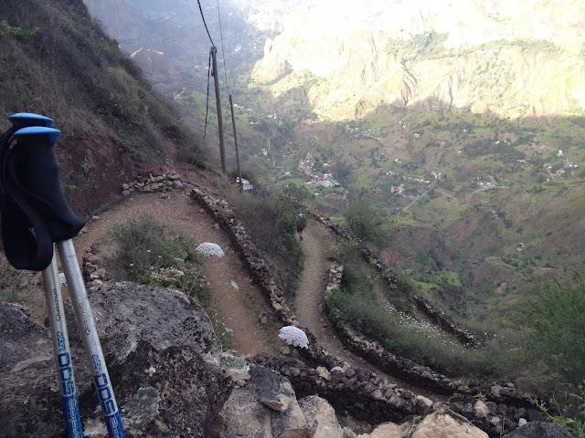Pendant un long moment, environ 2 à 3 heures, on reste à niveau. Je pense que le guide m’a fait passer par un sentier qui est plus en amont que l’itinéraire 310, qui avait la réputation de ne pas être très balisé, et m’a laissé plus ou moins au carrefour avec ce dernier. Il ne me restait plus qu’à descendre seul sur Monte Trigo, le village le plus à l’ouest (au sens géographique) de l’Afrique, complètement autonome au niveau de l’énergie grâce au photovoltaïque, qui possède également sa propre équipe de foot, où il n’y aucune route qui arrive (mais on peut envoyer des textos car le téléphone passe…)… Puis de poursuivre par le beau chemin côtier vers Tarrafal de Monte Trigo, avec pendant longtemps la silhouette du volcan qui me dominait.