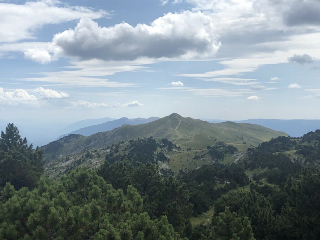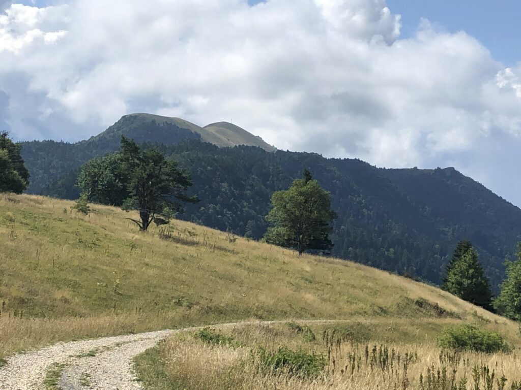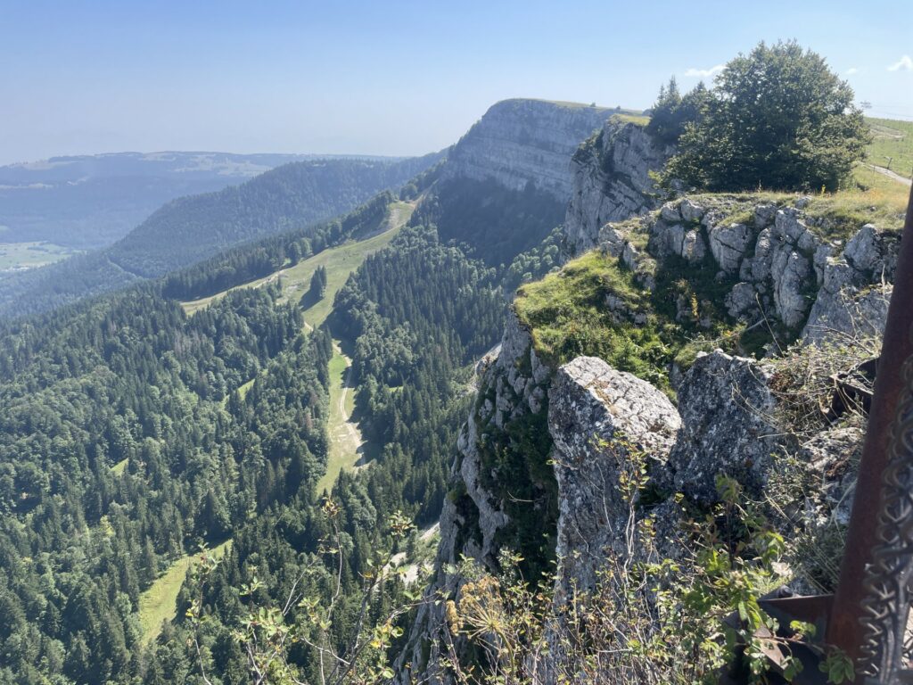 L’itinéraire se poursuit sur la ligne de crête le lendemain, passant par les deux plus hauts sommets du massif, le Crêt de la Neige (1720m) et le Reculet (1717m sur la carte IGN). Les deux portent bien leur nom. En effet, le premier est un bout de crête qui se détache à peine des autres affleurements rocheux. D’ailleurs, vu depuis le Reculet, on peut douter de celui qui est réellement le plus haut. Un article de presse régionale récent remettait en cause lalocalisation du point culminant du Jura. Ainsi cette deuxième étape sur les crêtes est constituée de montées et de descentes, ce qui fait que le dénivelé total reste plus important que prévu, et surtout, on ne trouve aucune ressource en eau, à moins de tenter de boire l’eau des goyas, ce qui même avec une pastille me paraît totalement absurde car ces goyas sont imperméabilisés avec du revêtement plastique. On peut donc imaginer, notamment avec le cagnard estival, les millions de microparticules de plastique qui passent dans l’eau. Le Reculet est lui très clairement détaché comme une pointe, au bout d’une vallée suspendue qui forme au bout une forme d’amphithéâtre à la lisière d’un plateau à couches horizontales. Après le Crêt de la neige, il suffisait de redescendre en direction de Lelex dans la vallée et de s’arrêter en chemin à un des deux refuges ou aires de bivouac. Car le refuge de la Loge était archi complet, nous avons choisi le Chalet pointu, super agréable avec un patron adorable qui nous fera découvrir l’attachant album photographique Joue contre Joux du photographe Julien Arbez. Alors si nous nous y sommes ravitaillés en eau, nous nous sommes aussi ravitaillés en Macvin… Le lendemain pour cette 3ème étape sur les crêtes, nous sommes remontés vers le sommet de la station puis pris la direction du col de la Faucille, en passant par le Colomby de Gex (1689m) et le Grand Montrond (1614m). Sur cet immense pâturage, là encore, le balcon sur les Alpes était au rendez-vous, les pentes plutôt douces, au dessus de la profonde vallée de la Valserine pour aboutir au sommet de l’autre station de ski du col de la Faucille, au Petit Mont Rond duquel nous sommes redescendus par un chemin aménagé à travers les pistes de VTT. L’approche de ce dernier sommet s’est faite ressentir avec l’affluence croissante de randonneurs qui y aboutissent grâce au télésiège ouvert l’été. Nous n’avions rien réservé et finalement nous avons trouvé à nous loger au col de la Faucille et nous sommes allés manger à la station au pied des pistes une morbiflette accompagnée d’une bouteille de chardonnay du Jura qui nous aura franchement bien aidé à nous réhydrater. Et comme nous mettrons la nuit à digérer cela nous profiterons également de la fraicheur de celle-ci en ouvrant en grand les fenêtres. C’est ensuite fin prêts que nous débuterons la dernière étape de ce parcours de balcon sur les Alpes, après un petit déjeuner en terrasse, en nous dirigeant vers Les Rousses et en faisant une petite incartade en Suisse pour gravir la Dôle (1677m). De ce beau sommet suisse, nous redescendrons tranquillement vers la petite ville en longeant parfois la départementale, puis la station de biathlon et enfin depuis le hameau transfrontalier de La Cure, l’itinéraire balisé « la voie royale » qui nous ramènera, par une petite route sans circulation bien agréable, sur laquelle veille en permanence la Dôle. Les Rousses seront une étape de repos idéale avec ses commerces, ses hôtels, son lac pour une baignade revigorante et son fort, dans les voûtes duquel vieillissent les meules de Comté et sous les remparts desquels on pourra faire un pique nique royal offert par les amis A., O. et C. de C..