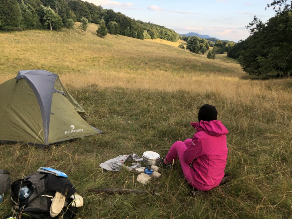 Pour conclure cette première journée, il suffira donc de se choisir un endroit pour bivouaquer et le col des charbemènes juste en contre-bas à 1310 mètres et 40 minutes de marche du sommet semble être l’idéal entre une pelouse clôturée et broutée par les vaches montbéliardes et la lisière de la forêt où nous sommes seuls. Nous essuierons pendant la nuit quelques petites averses qui seront bien les seules quasiment du voyage. Quelques rapaces planent dans le ciel et cette traversée du Jura semble parfaitement lancée. Nous avions encore suffisamment d’eau pour cuisiner et boire le matin. La suite lors de la première matinée passe au chalet d’Arvières, qui fait gîte et où nous n’avons pas demandé d’eau, tout près de l’ancienne abbaye. Il n’y aura plus d’eau jusqu’aux Plans d’Hotonne, arrivée de notre deuxième étape. Nous avons pu être approvisionné néanmoins par des locataires d’un chalet privé sur le chemin, qui eux-mêmes avaient amené leur eau puis donc finalement au bar près du stade international de biathlon de la petite station de ski, où nous avons passé un agréable moment avant de remonter de quelques centaines de mètres pour trouver le deuxième lieu de bivouac, tout aussi charmant que le premier avec vue cette fois sur le Grand Colombier au loin. Cette deuxième étape a alterné également passages en forêt et prairies d’altitude avec beaucoup de feuillus avec des altitudes comprises entre 1000 et 1300 mètres d’altitude passant d’une combe à une autre allègrement, par des sentiers mais le plus souvent par des pistes. Ayant vu quelques films dont l’histoire se passe dans le Jura et notamment Poupoupidou et le magnifique et presque inracontable Passe montagne de J.F.Stevenin, et ayant lu il y a fort longtemps des romans de Bernard Clavel, je n’avais du Jura qu’une vision imaginaire peu concrète mais faite de grandes étendues, froides et solitaires. Le massif est très varié du sud vers le nord mais j’avais l’impression que le début de notre itinéraire, bien qu’assez loin géographiquement des contrées décrites dans les livres et les films, plus au nord, nous mettait de plein pied dans cet environnement. Au réveil de la troisième journée, la vue sur la combe pâturée devant nous, la lisière des forêts et au loin vers le sud, en perspective le Grand Colombier sera la dernière à nous permettre de l’observer encore dans son intimité, sans la ligne à haute tension.