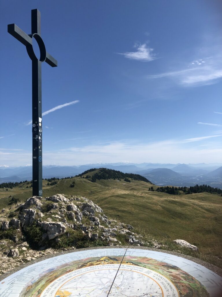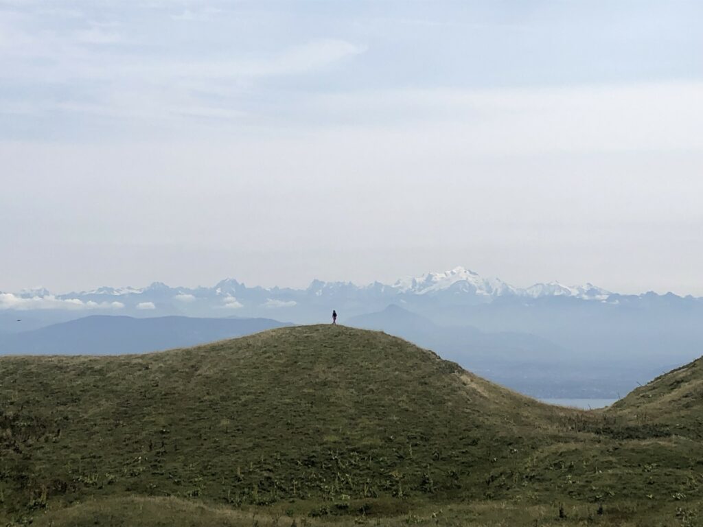 Le départ, depuis la gare de Culoz dans l’Ain, annonce la couleur avec la vue directe sur la première ascension du parcours. En effet, on se trouve alors au pied d’un versant de quasi 1000 mètres de hauteur à gravir. Mais si le versant est orienté plein sud, il est en large majorité couvert par les arbres dans ce massif boisé et une source vers 500 mètres d’altitude permet de remplir le premier litre d’eau vidé. Il n’y en aura plus. On sera dès lors récompensé de cette ascension par le panorama extraordinaire depuis le sommet de la pointe du Faufriolet (1180m) qui permet par temps clair d’embrasser tout le massif du Mont Blanc, et les grands lacs des Alpes, particulièrement le lac du Bourget que l’on domine quasi directement, ainsi que le Rhône. Le ton est donné. À partir de là, le cheminement se fait sur la large crête sommitale qui nous conduira d’abord vers le sommet du Grand Colombier, premier haut sommet du Jura à 1534 mètres, à travers forêts et clairières pastorales. Celui-ci est surmonté d’un pylone d’une ligne de haute tension, ce qui est dommage et on préfèrera alors l’antécime, de l’autre côté du col routier, parsemée de prairies d’altitude et surmontée d’une croix. Tout du long, la vue est extraordinaire et l’on est réellement au dessus des plaines urbanisées, au dessus du monde, en cette fin de journée, seuls à part au sommet.