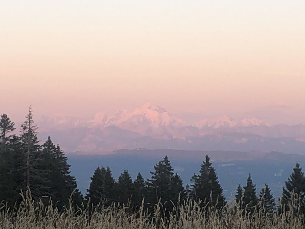 Au fond, c’était peut-être la partie que je désirais en premier visiter car c’est celle sur laquelle on parcourra la crête sur laquelle se trouvent les plus hauts sommets du Jura, à commencer par le Crêt de la Neige (1720m) et le Reculet (1719m sur la carte IGN). Le départ depuis Bellegarde sur Valserine est en bas dans la vallée, à peine 340 mètres d’altitude, et débute par une ascension de plus de 1200 mètres de dénivellation pour aboutir au sommet du Crêt de la Goutte, point culminant du Crêt d’Eau, à 1621m. La partie sud du massif du Jura est davantage composée de crêts plus ou moins parallèles séparées de vallées profondes sur-creusées par les glaciers du quaternaire (voir Le Jura, de la Montagne à l’Homme dirigé par J.Boichard) lCette ascension n’est pas difficile en soi, si ce n’est qu’elle est orientée plein sud, et que quelques passages dans la forêt au dessus du dernier hameau de Métral sont étonnements raides avant l’arrivée à la cabane de Sorgia d’en bas. L’étape se poursuit après le sommet vers le chalet du Sac au dessus de Menthières avant de se terminer au beau chalet de La Poutouille. Là a été aménagé une cuve pour récupérer du toit l’eau de pluie. C’est aussi pour cela que nous y avons fait étape, rencontrant à l’occasion deux éleveurs qui venaient prendre de l’eau pour leurs vaches qu’ils venaient parquer là pour la nuit à cause de l’arrivée du loup dans le secteur, nous ont-ils dit. Probablement, à mon humble avis, nous avons pu observer ce jour-là les deux plus beaux panoramas de notre itinéraire. Celui du Crêt de la Goutte m’a paru le plus complet de par sa position qui permet un 360° sur le Jura et les Alpes et une vue directe sur le grand jet d’eau de Genève et les avions qui atterrissent à l’aéroport juste en dessous. Celui de la Poutouille était exceptionnel avec sa vue directe sur le Mont Blanc, de rose vêtu, au couchant, au delà de la cime des sapins et au dessus des épilobes fuchsias.