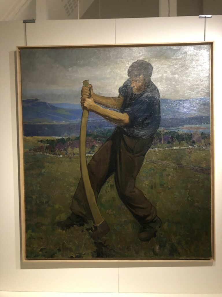 Photo 13: Au musée municipal de Pontarlier; Le tableau Arracheur de gentiane d’André Roz datant de 1929. « D’après modèle vivant, il représente un « gentiannaire » en pied. L’homme arrache les plants de gentiane à l’aide d’une sorte de pioche surnommée « ancre » ou d’une fourche associée au diable. Cette tâche saisonnière de la région demandait une grande force physique. Cette composition est imprimée en grand nombre pour les étiquettes de la marque de La Suze. Elle est utilisée pour un calendrier. Robert Fernier s’intéresse aussi à cette pratique. Il dessine les gentianaires pour l’image « Châteleu vu des Maillots » qui illustre le roman de Romain Roussel, La vallée sans printemps. »(D’après la notice du musée). Cet alcool se fabrique également dans le massif central, les Vosges. Il faut 15kg de racines pour un litre d’alcool.