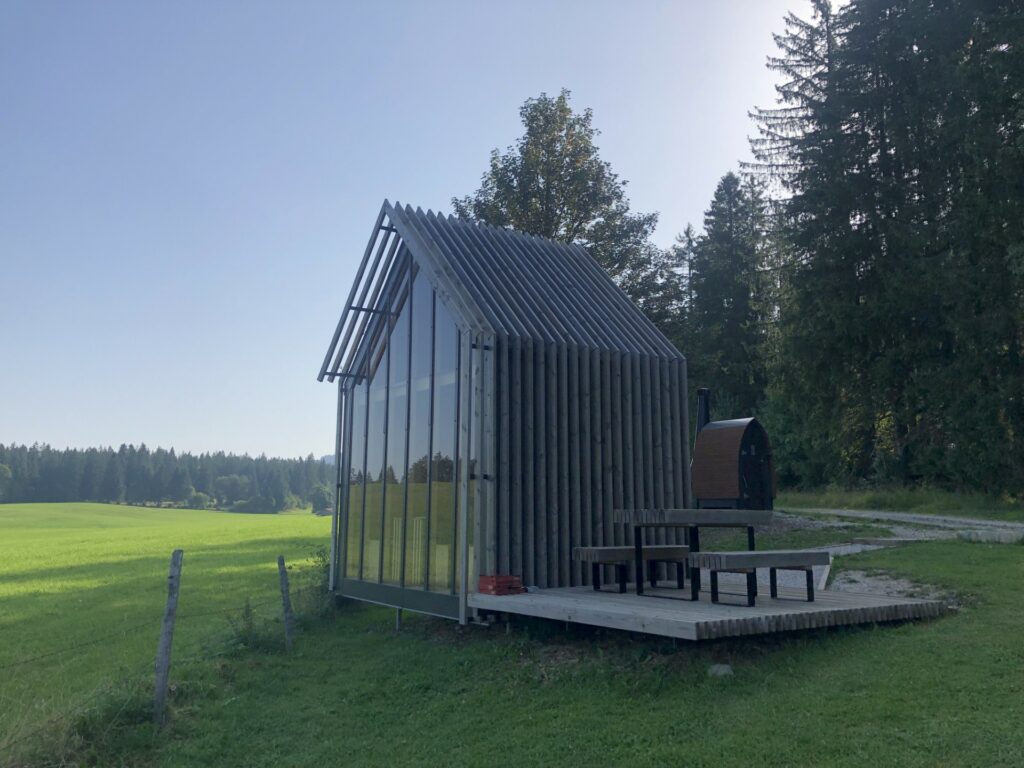 Photo 14: La cabane de la Halte des Seignes aux Gras. Ce projet innovant permet aux pratiquants de sports de pleine nature d’avoir un abri et une aire de repos sur le tracé de la Transjurassienne. L’article du journal La Presse du Doubs vous donnera davantage de précisions.