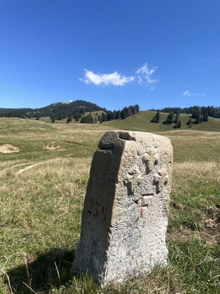 Photo 10: Au fond, la Dôle vue depuis le côté français, juste avant la borne frontière. Nombreuses d’entre elles ont été déplacées en 1819 afin de délimiter précisément la frontière, favorisant ainsi la contrebande. Aussi, de nombreuses petites cabanes de douaniers parsèment l’itinéraire.
