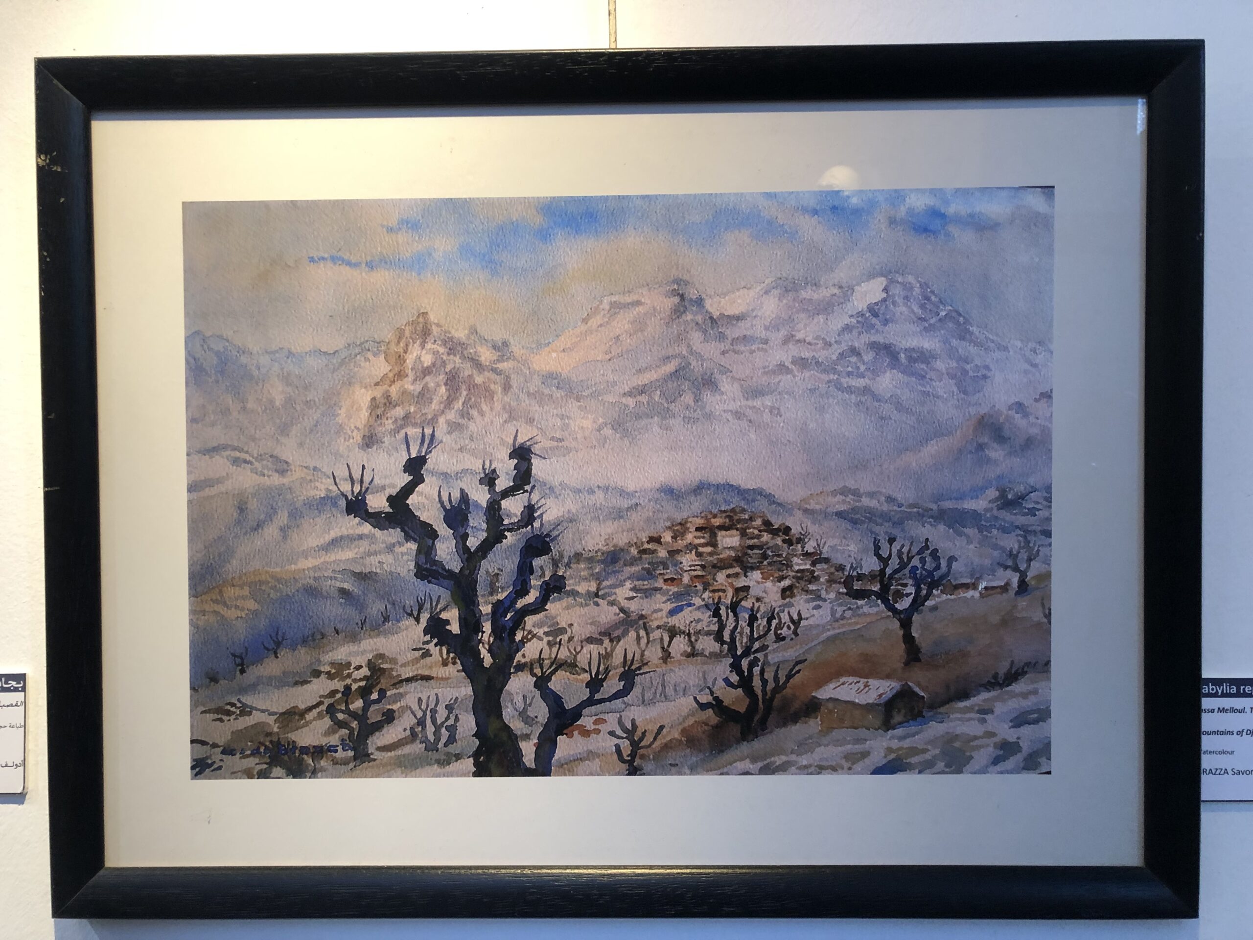 Mais la ville n’a pas que les vestiges de cette période. Les différentes résidences du régime du dey d’Alger d’avant la colonisation offrent également des sites remarquables avec leurs patios et leurs parcs qui rappellent quelque peu l’Andalousie. Le musée du Bardo par exemple en occupe une. Enfin, dominé par l’élancé monument aux Martyrs, le fameux musée des beaux arts offre une collection riche et magnifique de grands maîtres européens mais aussi de peintres moins célèbres qui étaient en résidence d’artistes et qui ont peint de nombreux sites comme Alger, Tipaza ou les montagnes de la Djurdjura proches de la ville. Nous étions venus à Alger pour voir des tableaux d’Etienne (ou Nasredine) Dinet et nous avons aussi pu voir que des oeuvres de la peintre algérienne Baya étaient également exposées dans la salle surannée et si charmante de la bibliothèque du musée et dans une autre salle ceux de Mohamed Racim. Mais l’aquarelle de Claude Savorgnan de Brazza intitulée Tassa Melloul, vue sur le village et les montagnes de Djurdjura m’a laissé un souvenir particulier avec son paysage enneigé des montagnes et le village sur des lignes de crêtes, caractéristiques de la Kabylie.